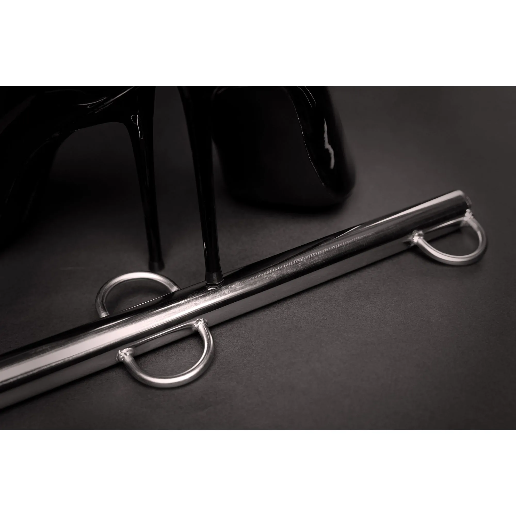 Fabricada en metal resistente con acabado plateado, esta barra separadora ajustable permite personalizar la distancia entre brazos o piernas, adaptándose a distintos niveles de restricción. Su diseño incluye múltiples ganchos estratégicamente ubicados, que facilitan la conexión de esposas, muñequeras, tobilleras o cuerdas bondage, multiplicando las posibilidades de juego erótico.