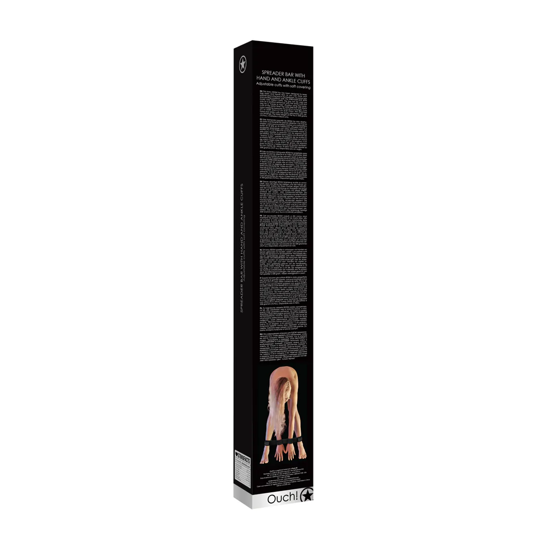 Diseñada para mantenerte inmovilizado y expuesto, esta barra metálica de 70 cm de longitud incluye esposas ajustables para muñecas y tobillos unidas con correas de nailon resistente. Gracias a sus cierres de velcro, se ajustan fácilmente al cuerpo, proporcionando comodidad y seguridad durante el juego.