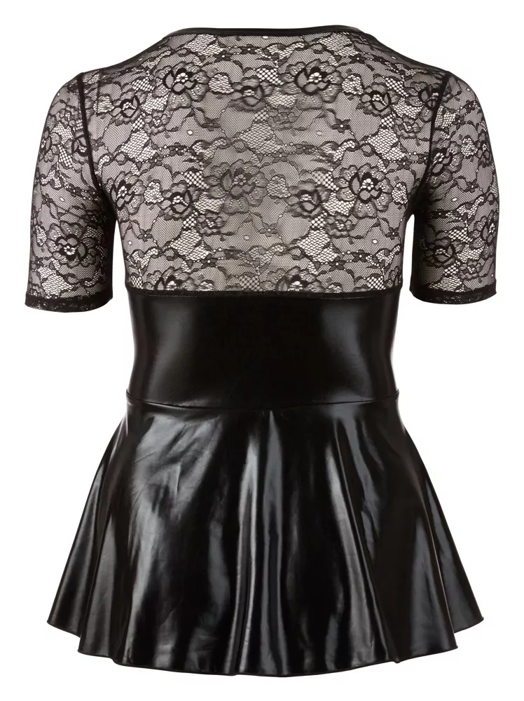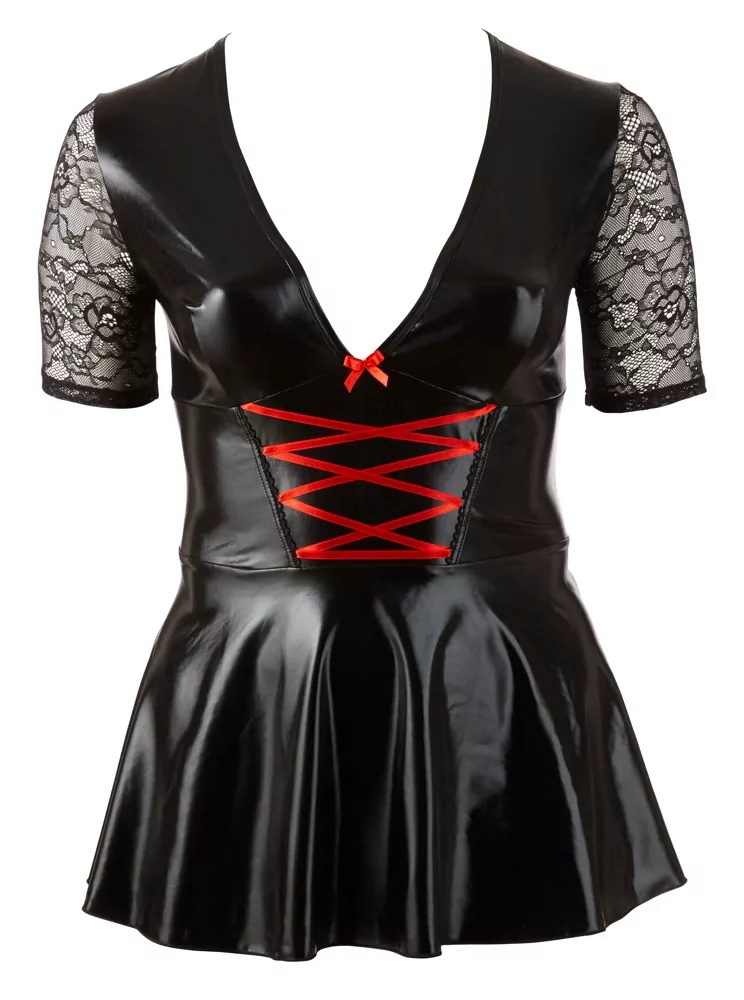 Minivestido con encaje rojo en el escote pronunciado, mangas cortas de encaje y falda acampanada. Espalda con aplique de encaje.