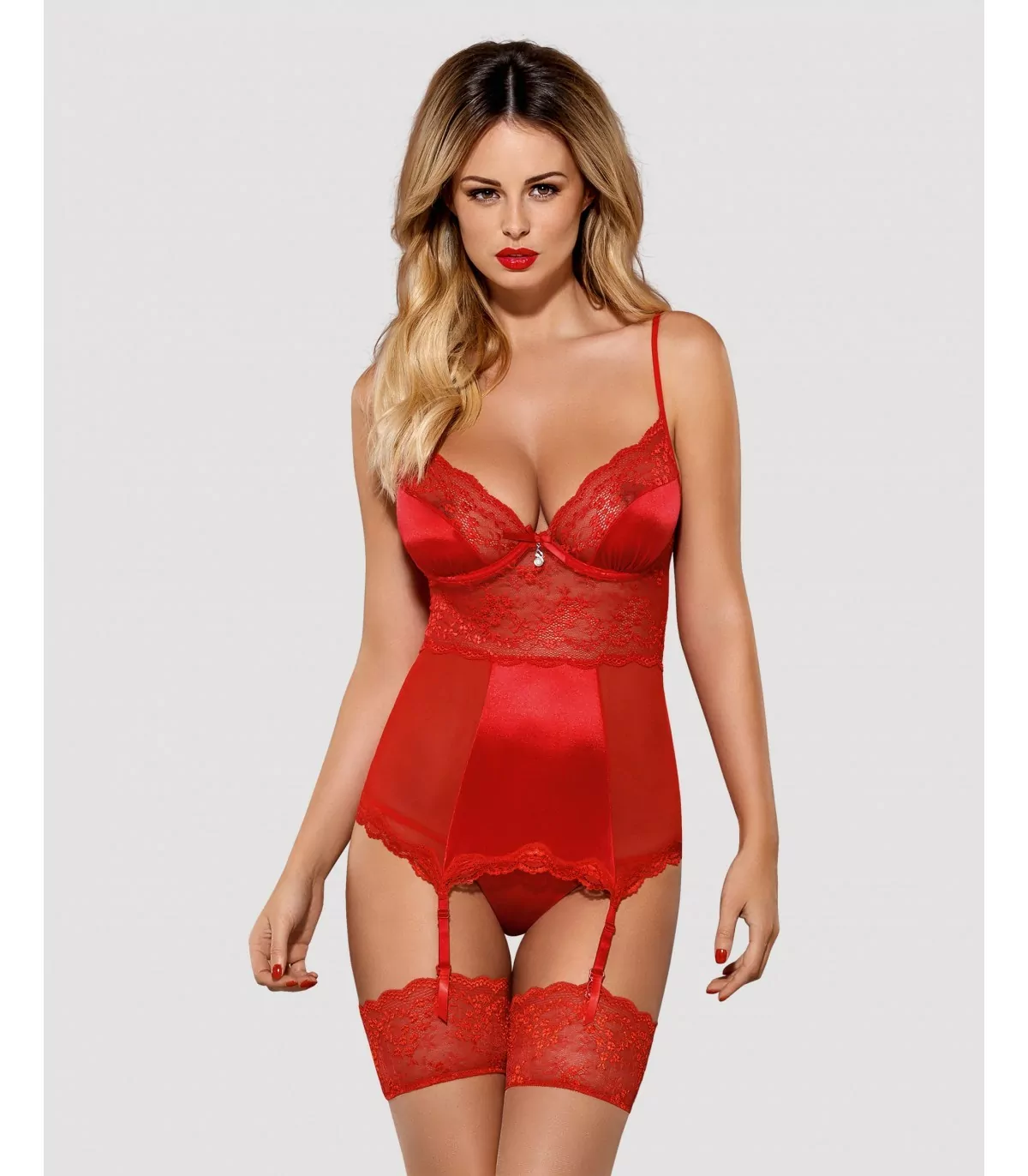 Este corsé rojo cuenta con copas con aros que realzan el busto de forma sutil, tirantes y ligas ajustables para un ajuste perfecto y detalles femeninos como un delicado lazo y una joya de perla entre las copas. La inserción de encaje en la zona de las costillas y la espalda aporta un toque romántico y sofisticado.